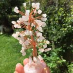 Approx 10 cms tall. Base is 4 cm diameter and is quartz with rose quartz crystals around the base of the tree