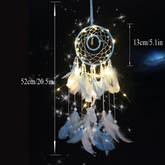 This beautiful Led Dream catcher also has a rocking horse charm at the centre and white beads surround the inside of the outer ring. The feathers are blue and white and this will make a lovely decoration to a child’s bedroom. They are a great gift idea too.